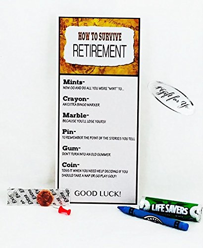 -. Feature : A fun, humorous interactive Gift Card for the New Retiree in a variety of styles / This survival kit contains assorted items attached to sayings, meant to help the Retirement process! / Items and sayings such as: Mints - Now go and do all you were mint to...; Crayon - An extra Bingo marker; Marble - Because you'll lose yours!; Coin - to toss when you need help deciding if you should take a nap or go play golf; etc. / A wonderfully unique gift that is sure to bring laughter and smiles to the new retiree! Packaged together including a 'gift for you' label. / A gift message will gladly be included - please select at checkout