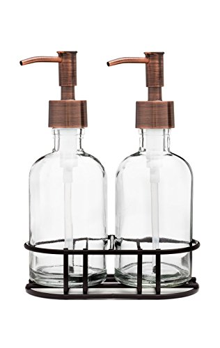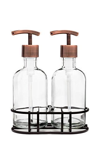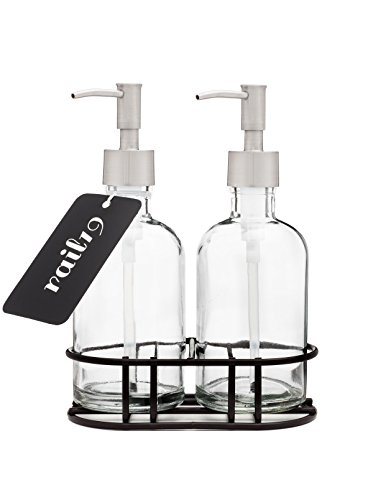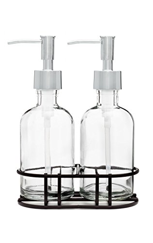 -. Brand : Rail19 -. Color : Clear -. Feature : Set of 2 Refillable Glass Soap Dispensers / Lotion Dispensers + 1 Black Metal Stand / Features a Metal Pump to Coordinate with your Kitchen and Bath + Attractive Glass Base / Keep your Sink + Countertop Tidy - Refillable Glass is Perfect for Lotion, Liquid Soap, Sanitizer, Facial Cleaners, DIY Soaps and More! / Each Soap Dispenser Stores Approx. 8 fluid oz. / Black Metal Soap Dispenser Stand Measures Approx. 5 3/4 Inches Long + 3 1/4 Inches Wide -. Label : Rail19 -. Manufacturer : Rail19 -. PackageQuantity : 2 -. ProductGroup : Home -. ProductTypeName : HOME_BED_AND_BATH -. Publisher : Rail19 -. Size : Set of TWO 8 oz Glass Soap Dispensers -. Studio : Rail19 -. Title : Glass Soap Dispenser Set with Metal Soap Pump and Metal Stand -. Warranty : Manufacturer warranty for 30 days from date of purchase.