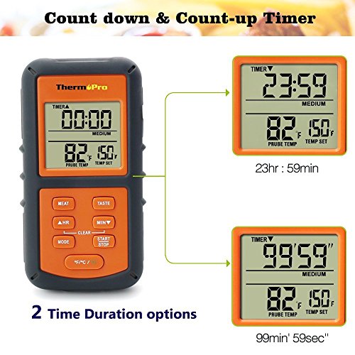- A timer included in cooking food thermometer can function and display at the same as you’re monitoring meat temperature, no need to purchase a separate timing device. Built in an audible alarm, so you never overcook your timed vegetables.