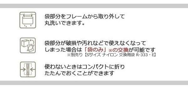 | 素材・材質 | 袋部分:ナイロン フレーム:スチール(表面クロームメッキ) 底板:2.5mm厚低発泡ポリエチレン |