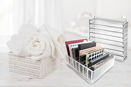 Studio : FAJ Publisher : FAJ Product Description Are you the kind of person who forgets to use makeup that you can't see set out? Are you tired of searching through your drawers for your perfect blush? Is your bathroom counter an unorganized mess? For us ladies obsessed with eyeshadow palettes, the FAJ makeup pallet holder is a must-have addition to any vanity or bathroom top! All of our eye shadow pallets, brushes and lipsticks at our fingertips! Get organized with the FAJ makeup organizers for counter that are: Stylish and Durable Designed by a makeup artist, the FAJ vanity makeup drawer organizer allows you to organize different size pallets, brushes and cosmetics in one easy to find place. Crafted from high grade, durable, clear acrylic that won't crack or come apart overtime. The eye shadow pallet organizer's Smart Design allows for use standing upright or laying in a drawer, vanity, bathroom or closet. Quality and Value At FAJ, our mission is to provide quality products at affordable prices. We use the FAJ countertop makeup organizer ourselves and truly love this eyeshadow palette holder! Our 7-shelf organizer was designed to save space, protect and display our own makeup and yours! Our rigorous quality assurance process and secure packaging ensures your drawer organizer for makeup arrives in perfect condition. Versatile Must Have Fits popular makeup palettes such as Urban Decay, LORAC, MAC, Anastasia, Too Faced, Kat Von D, Jane Iredale, Sephora Avon, Mary Kay, Colorscience and Bobbi Brown. Store lipsticks, nail polish, skin care and so much more! A must-have for any makeup lover, novice or pro! Size Dimensions Overall size outside (inches): 9.5 Tall 9.5 Wide 2.75 Deep Each inside compartment is approximately: 1.0 Tall 8.5 Wide 2.25 Deep If You've Been Looking for A Better Way to Store Your Palettes and Beauty Essentials This Is The Must Have Eyeshadow Pallet Organizer for You! 0
