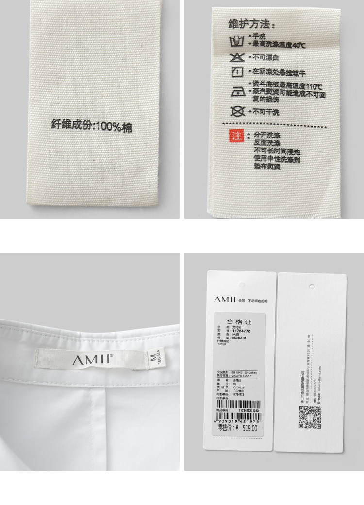| 洗涤标准: | 不可浸泡悬挂晾干不可干洗不可漂白110℃以下垫布熨烫40℃以下手洗 |