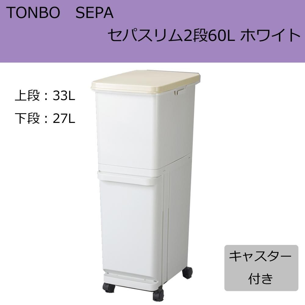 場所を取らないスリムタイプです。キャスター付きで、移動や掃除が楽にできます。 製造国:日本 素材・材質:本体:ポリプロピレンキャスター:ポリプロピレン、他 商品サイズ:44.5×30.5×87cm 重量:約3700g 仕様:容量:60L(上段:33L、下段:27L)抗菌加工 付属品:取扱説明書 ※サプライヤー直送品 ご注文後3~4営業日後の出荷となります【商品名】TONBO SEPA セパスリム2段60L ホワイト