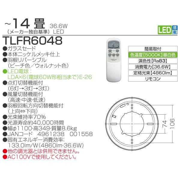 | 仕様 | ガラスセード 本体ニッケルメッキ仕上 羽根リバーシブル(ビーチ色/ウォルナット色) LED電球:LDA×6(電球60W形相当まで)E-26 点灯切替機能付(6灯→3灯→3灯) 風量切替機能付(高速・中速・低速) 羽根回転方向切替機能付(上向⇔下向) ~14畳(メーカー基準) 光束維持率:70% 光源寿命:約40000時間 固有エネルギー消費効率:133.0lm/W(4860lm・36.6W) 簡易取付 色温度:5000K(昼白色) 演色性:Ra83 消費電力:36.6W 定格光束:4860lm(810lm×6灯) ※他の調光器とは併用できません。 ※AC100Vで使用してください。 |