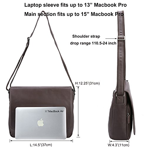 -. Feature : Genuine cowhide leather, soft cotton poly lining and fine stitching / The leather messenger bag with magnetic button closure, roomy for laptop, notebooks, file folders, pens, cellphone and wallets / Adjustable shoulder strap fits your size. Padded pocket for 14 inch laptop. Mutil pockets for all your belongings / Used as business messenger bag, shoulder laptop bag, school bookbag. Fits for school, work or daily going out / Size: 14.5 x 4.3 x 12.25 inch (37 x 11 x 31 cm); Net Weight: 1.1 kg; Packing: Branded non-woven bag