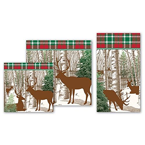 - Silhouettes of deer appear as if by magic among serene birch trees and frosty pines; design is paired with a Warm red-and-green plaid