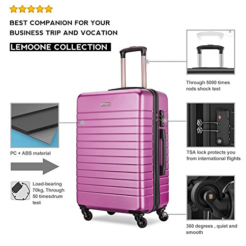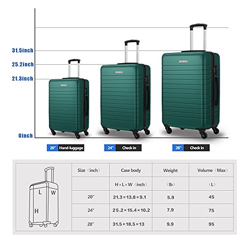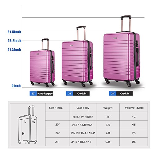 Product Description Best choice for Traveling ,perfectly fit for business or family use Transport your travel essentials effortlessly and stylishly. This extremely lightweight and durable spinner was made by ABS and PC materials, which bring together the advantages of both materials. A 28" spinner case can be checked at the airport, a 24" bag can be used in a 5-7 days journey and a 20" carry-on to hold the items that you need to keep close at hand. Each case is detailed with an internal chrome telescoping handle, 360°directional spinner wheels offer excellent mobility, and grab handles for easy lifting. Internal lining of each suitcase has crossed straps to tighten your clothes, another half has a zippered curtain to protect your privacy, and two small mesh pockets for small items. SPECIFICATIONS: