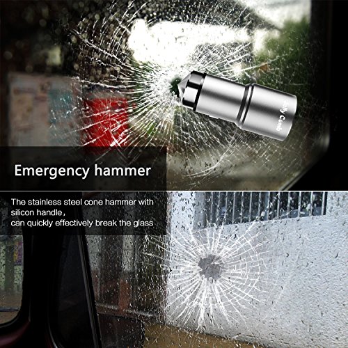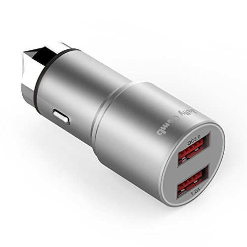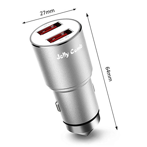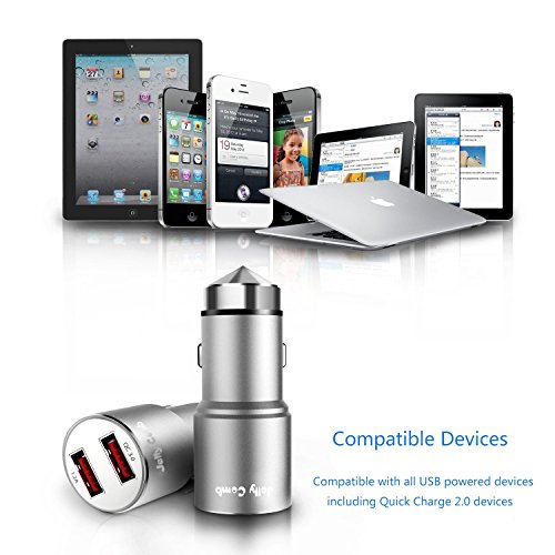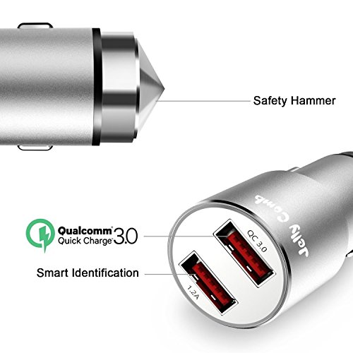 Quick Charge 3.0 Car Charger, Jelly Comb QC 3.0 Aluminum Alloy Dual USB Car Charger with Security Hammer, for iPhone 7/7 Plus/6s/6s Plus, iPad Pro/Air 2, Samsung Galaxy/Note, LG, Sony and More, Silver
