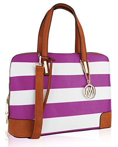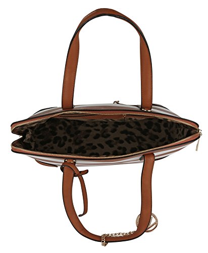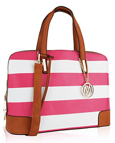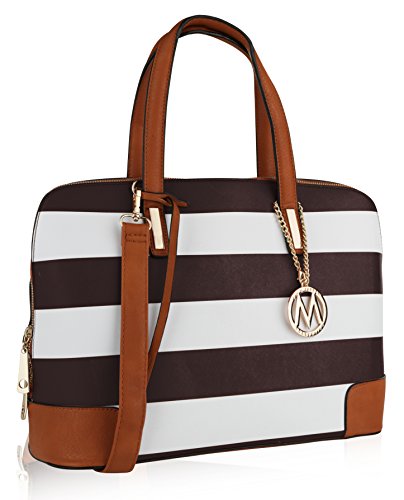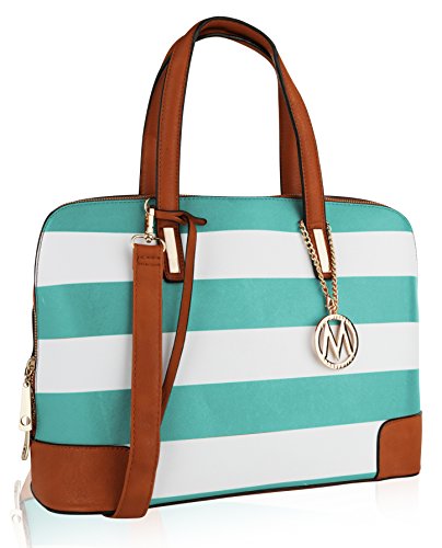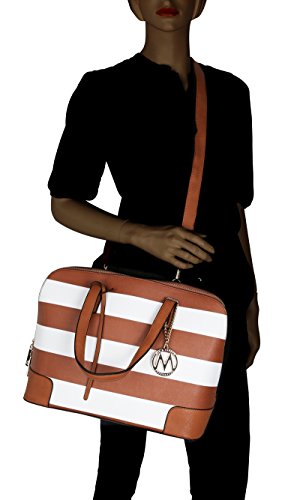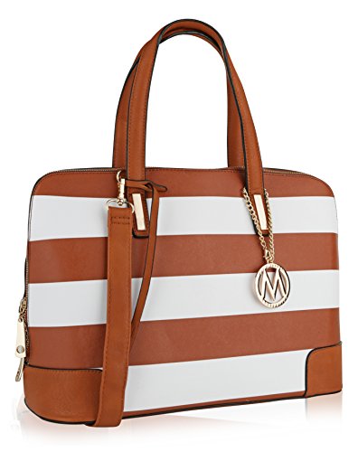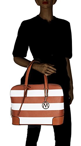 These designer handbags are part of the MKF Collection by Mia K. Farrow, they're manufactured of high quality faux leather giving it durability for long lasting use. Gandhia has a secure zip top closure to keep your daily essentials from falling out. MKF Collection handbags always keep their interiors very interesting, in this case this satchel handbag interior features three separate compartments; one is a wall zippered pocket with a spacious compartment, mid-zippered compartment and one spacious compartment with slip in pockets. The exterior features a back zippered pocket, gold tone bottom studs to keep purse uright and a gold tone MKF Collection removable keychain topping it off by giving it a chic look. Not to mention it has two very comfortable twin top handles that measure 7.5 in long and a removable/adjustable shoulder strap that adjusts up to 43 in long to help boost up the look in your outfit of choice and giving you the potential to wear it as a crossbody handbag, a handbag or shoulder bag. The approximate measurements of this satchel bag are 15 in L x 10 in H 6 in D. This MKF Collection designer handbags will prompt you instant style no matter where you're standing.Feature