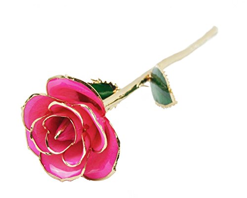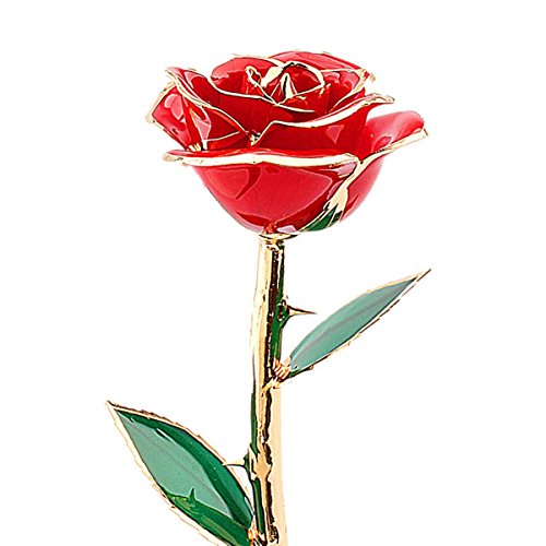 One of Nature's most precious and exquisite gifts. Now FOREVER preserved in 24K GOLD! SAVE BIG! The Rose... a traditional symbol of love and beauty down through the ages. But once picked, so fragile and temporary... until now. Each Rose is freshly cut at the height of it's beauty, then immediately preserved in a thin layer of lacquer compound. The preserved Rose is then beautifully finished in pure, 24K gold for all time. Choose from three stunning colors. Red and Pink Roses have a gold-dipped stem with gold trim highlighting the leaves and petals. The Gold Rose is coated entirely with 24K gold. The next time you want to show your love... do it with a Rose wrapped in immortal 24K gold, will never die or fade away. Approx. 11" long. State Color. A gift to last an eternity! Act Now! Single 24K Gold Real RoseFeature