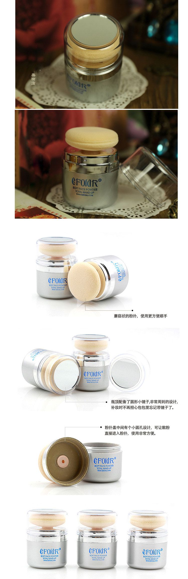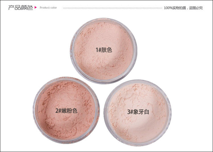 Powder, also known as loose powder, use a lot of methods, can be finished in painted cream or primer, a slight flutter Suifen, shaping a weak natural makeup; also can be coated finished liquid foundation makeup immediately after the attack, stability, part of oil absorbing effect, for makeup purposes,made Zhuang Rongbao hold more lasting; and the use of different colors of the powder, can be modified face, or as an eye shadow or blush use, effect nature. With sponge head and a small mirror, may at any time to decoratepink face, very convenient to use.