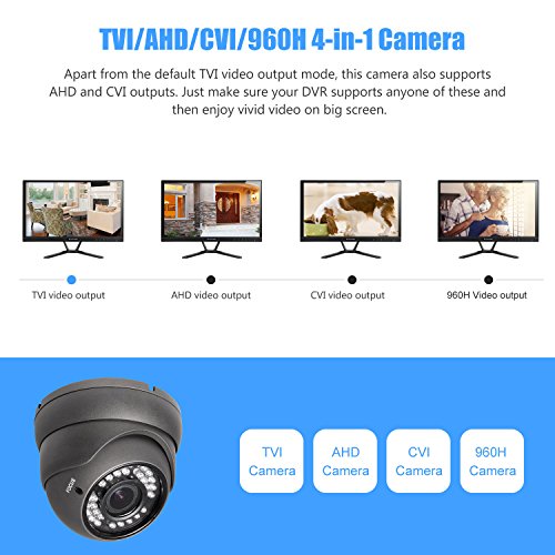4 IN 1 Security Camera :It has OSD Menu that can change the 4 different video output TVI,AHD, CVI and CVBS (700TVL) and adjust the video setting.