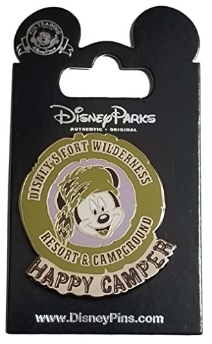 - A round pin showing Mickey Mouse wearing a Davy Crockett coonskin hat. The border reads "Disney's Fort Wilderness Resort & Campground"