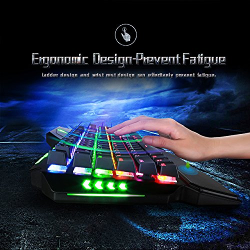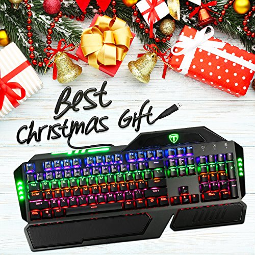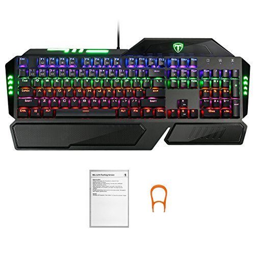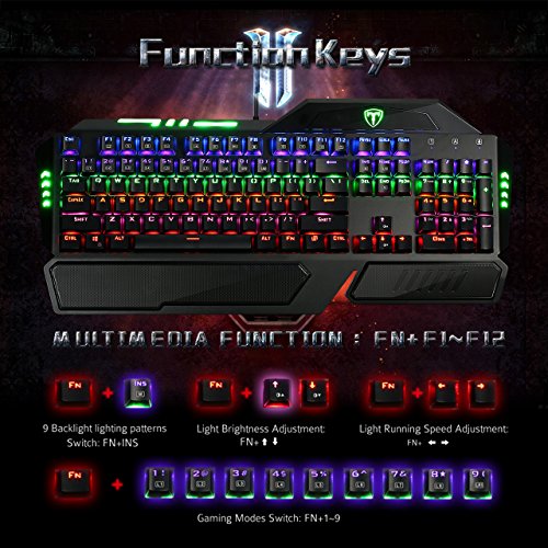 Tips: There are 9 light effect modes for option. You can't change the colors of the key lights, but you can change the pattern used to illuminate them, speed of the pattern, and illumination level. 1.How to close the light: Keep pressing fn+ until adjusting backlight down to the minimum brightness level 2.How to open the light: Pressing fn+ to increase the backlight brightness 3. How to change the effect modes: Fn+ins4. How to adjust backlight brightness: Fn+ and 5. How to adjust light running speed: Fn+ and 6. For more details pls see user manual blue switches click sound, fast response, let you become the hard-core in the game durable keys can bear 50 million times keystrokes. Made of metal material, with matte-finish texture, it is sturdy and robust enough to protect it from scratch, bump and corrosion. Complimentary key cap puller tool we offer you a key cap puller for free. With this gadget, you can pull your key caps easily when you want to clean your keyboard or frequently change your key caps. On-slip design under the keyboard, there are two rubberized holders to prevent it from slip. Shortcut function key series of short functions keys works well if they are combined with fn key. Specifications: Color: Black key quantity: 104the keyboard size: 364*153*37mmworking voltage: 5.0v DC interface: USB interface mechanical switch type: Blue switch (with click sound) key elastic force:60g15gkey stroke travel: 4.00.2mmkey lifespan: 50,000,000 times strokes.Feature