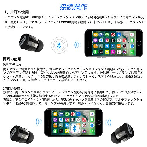 -. Feature : 【技適認証済】【完全左右独立型ワイヤレス】ケーブルが一切ない革新的な完全左右独立型ワイヤレスイヤホンです。一人でも二人でも同時に使用可能、Bluetooth 4.1対応なので、最大距離は10メートル(障害なし)で、恋人同士や友達同士で音楽を楽しむことができます。技適認証番号:007-AF0164 / 【快適なフィット感】超軽量&超小型な設計で、イヤーピースも3セットがあるので自分にぴったり合うフィット感良いのを選択できます。 / 【高音質&ハンズフリー通話可能】ノイズキャンセル機能を搭載して、外からの音を軽減し、より美しいステレオ音質を楽しめます、マイク内蔵なので、クリアなハンズフリー通話を実現できます。 / 【革新的な設計】ワイヤレスイヤホンとモバイルバッテリーを一体化する革新的なデザインで、創造的な磁気で吸着する充電可能です。イヤホンのバッテリーが55mAhで、約3時間の連続使用時間可能です、2100mAhの大容量モバイルバッテリー付きますので、一回フル充電で約15回のイヤホンを充電、最大45時間のイヤホン使用時間を実現可能です。通勤通学にご使用いただいても、充分なスタミナを確保。バッテリー不足を心配せず、長時間安心してご使用いただけます。 / 【パッケージ内容】●TWS-EH10 Bluetoothイヤホン+モバイルバッテリー 本体 ●イヤーピース×3ペア(S,M,L) ※M初期装着●USB充電ケーブル●日本語取扱説明書 ※電子版の日本語説明書も用意しておりますので、必要な場合はご注文番号を記入の上、弊社までご連絡ください。また、お買い上日より12ヶ月の保証期間がついております。万が一商品に不具合がある場合は、弊社にご連絡いただければ日本語スタッフが迅速に対応いたします。