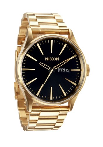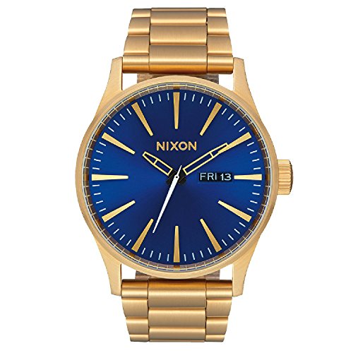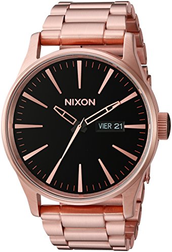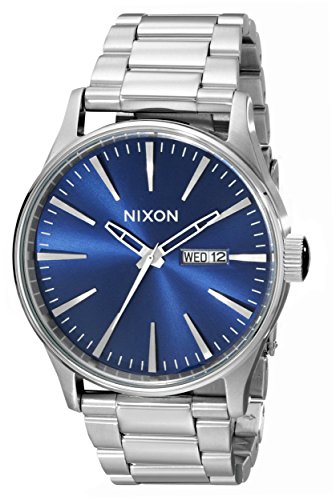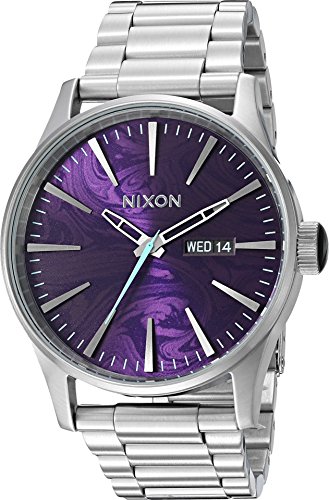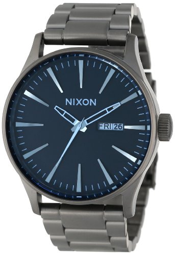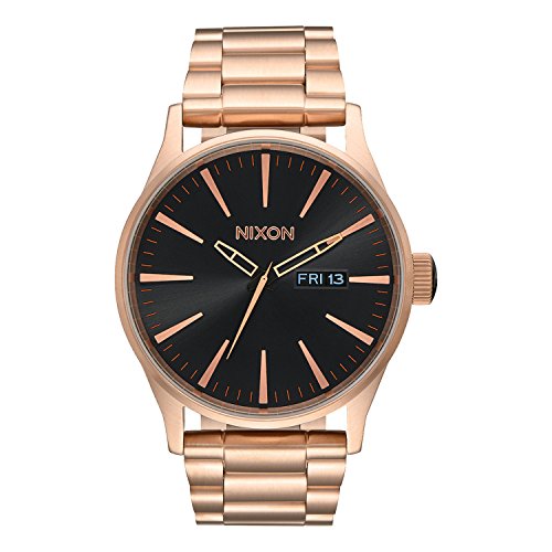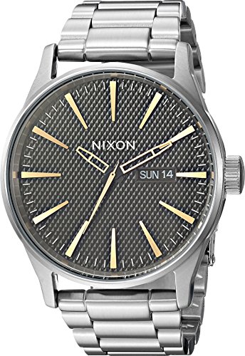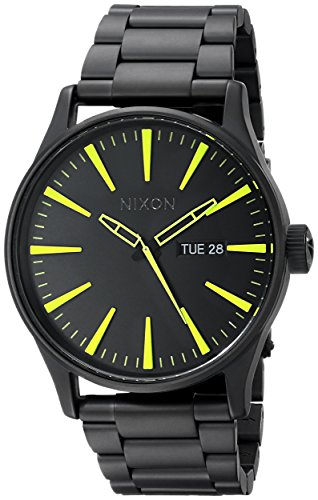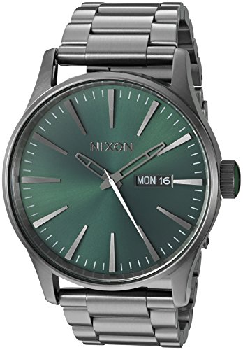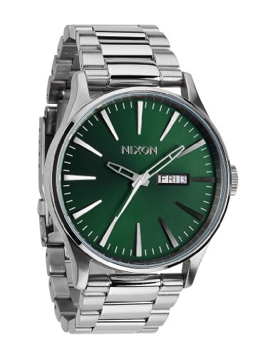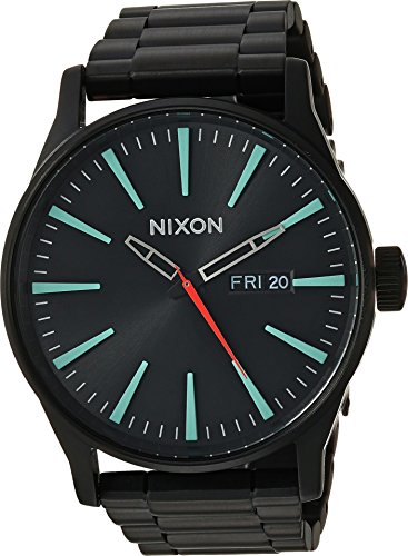 There's no chain of command here; it's all you with The Sentry SS watch from Nixon®. Nixon's Chromacoat (Matte Black/Industrial Green): Chromacoat is a top color that chips away with wear and age to reveal a unique undercoat. Through normal wear and tear, this special finish will scratch and chip showing you what a life well lived will look like, creating a completely individual and custom version of the watch. Custom solid stainless steel case. Hardened mineral crystal. Triple gasket crown with enamel fill, stainless steel screw down caseback and spring pin lugs. Tapered custom solid stainless three-link bracelet with micro adjust double locking clasp. Miyota Japanese three-hand quartz movement with day and date display. Dial features:• Applied indices.• Printed seconds track.• Custom molded hands with luminous fill. Water resistant up to 100 meters. Imported. Measurements: Case Height: 42 mm Case Width: 42 mm Case Depth: 12 mm Band Width: 1 in Band Circumference/Length: 8 in Weight: 4.6 oz This product may have a manufacturer's warranty. Please visit the manufacturer's website or contact us at warranty@support.zappos.com for full manufacturer warranty details.Feature