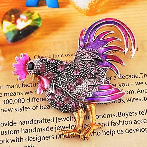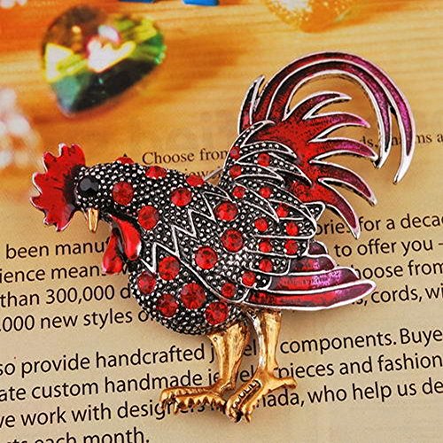 -. Feature : Bejeweled Rooster in Rhinestone Crystals Brooch Pin / Brooch Pin in the shape of a rooster. / The rooster is decorated with rhinestone crystals