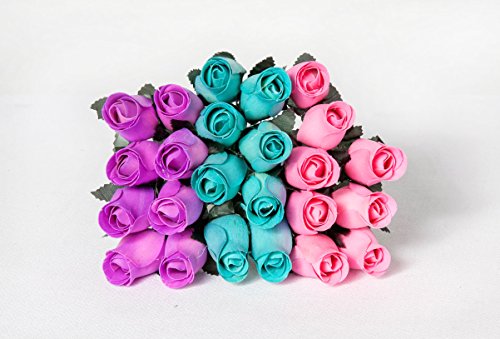 24 Realistic Wooden Roses - Light Blue, Purple, Pink