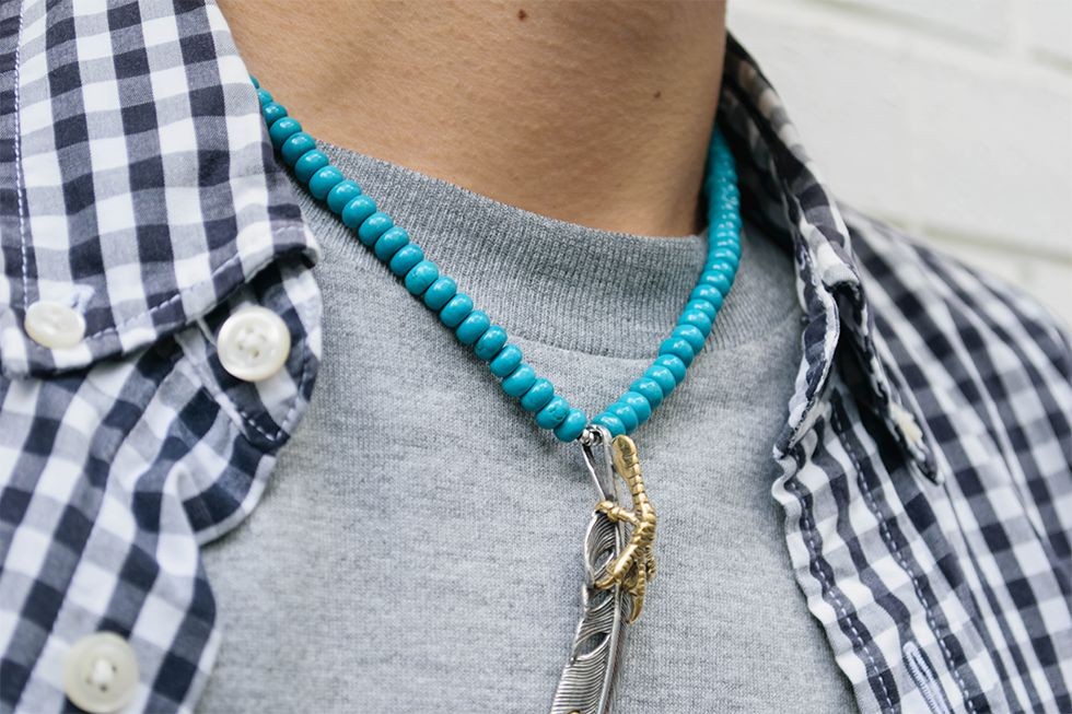 こだわりぬいたパーツにより構成されたネックレス。スタイリッシュなデザイン、胸元のアクセントとしておすすめアイテムです。ファッションやニーズに合わせたユニセックススタイルとなっております。【サイズ】縦7.5cm 横1.5cm(ペンダントトップ)45.0cm(ネックレス・留め具を含む)【素材】ピューター(ペンダントトップ)ハウライトターコイズ(ネックレス)合金(留め金)【仕様】希少な6mm玉 ボタンカットのハウライトターコイズを使用