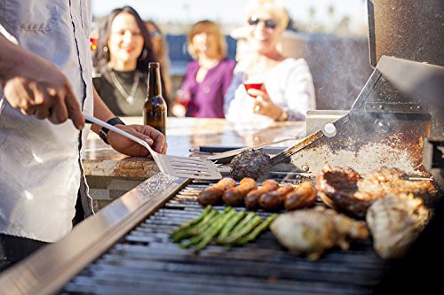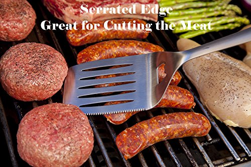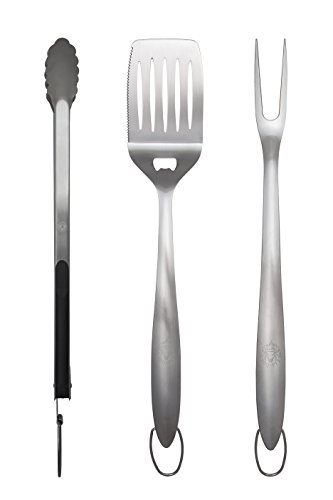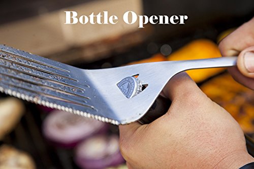 TOOLS OF THE TRADE – Our 3-piece tool set includes an oversized spatula for easy flipping of even the largest burgers complete with a bottle opener to keep the grill master happy and a sharp serrated cutting edge for checking the meat - A meat fork with sharp long tines for stabbing even the toughest foods and a set of locking tongs with scalloped claws to allow handling of delicate stuff