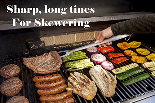 NOT YOUR GRANDMOTHERS BBQ SET – This Professional Quality BBQ kit is molded with 1.5mm thick solid stainless steel – The fork and spatula are each crafted from a single piece of beautifully brushed stainless steel and the tongs are molded from 2 individual pieces of brushed stainless steel fastened together with a stainless steel rivet- This stainless steel will not rust and is dishwasher safe - Each piece measures almost 18” long to keep your hands free from the heat