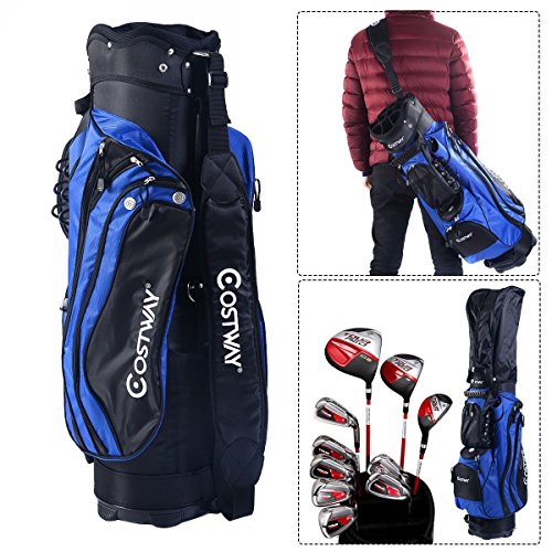 Brand New And High Quality Fourteen Individual, Full Length 14 Way Dividers Large Garment Pocket Comfortable Double Shoulder Strap System Hip Pad For Comfort And Additional Air Flow Specifications: Color: Black Blue Material: Polyester Fabric, Within The Three Fiber Supporting Tube, Aluminum Paint Foot Pipe Support, A Rubber Foot Pipe Bracket, PP Plastic Parts, Plastic Chassis Size Of Head Cover: 9.5" Material Of Rain Cover: Polyester Fabric Unit Weight: 6.6lbs Package Includes: 1 X Carry Bag, 1 X Rain Cover(Placed Inside One Pocket) Note: The Golf Sticks In The Pictures Are Not Included In The Package. 0