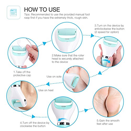 Easy to Use Insert the roller into the device, check that the roller head is securely attached to the device before use. And then turn on this pedicure foot file. Gently remove dead skin from your feet with 360 degree rotating head