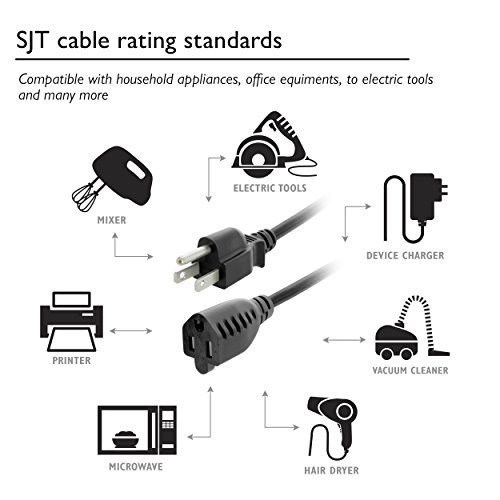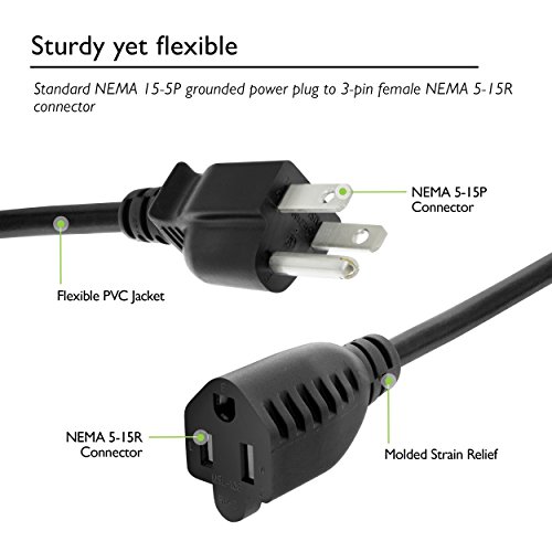 FLEXIBLE YET STURDY with a standard NEMA 15-5-P grounded power plug and 3 pin female NEMA 5-15R connector; SJT 13A/300V/1625W rating easily extends home or office electronics with power consumption of 200 watts or less