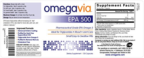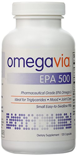 -. Title : OmegaVia EPA 500. Pharmaceutical Grade EPA Omega-3. Triglyceride-form EPA-only formula, 120 Capsules. 500 mg EPA per pill.