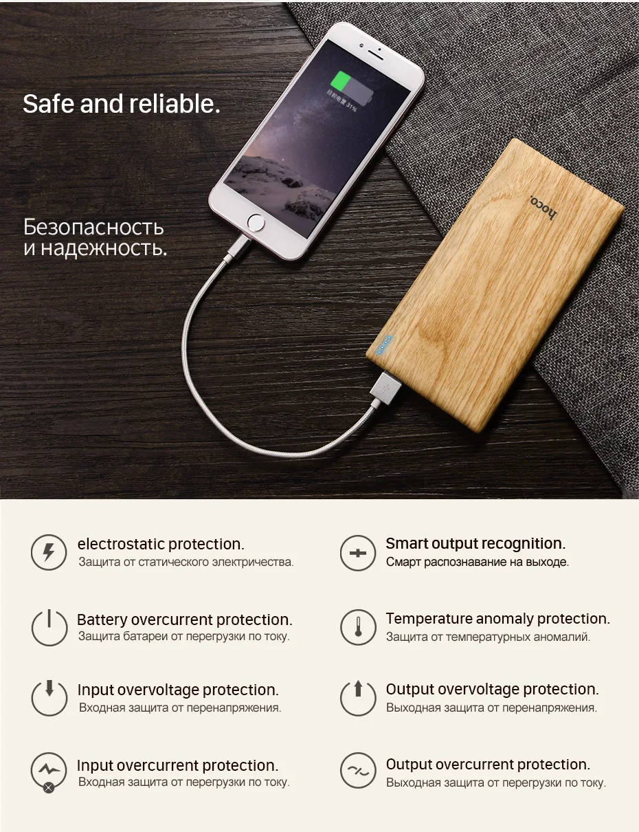 3. ABS+PC fire-resistant material, LED power indicator allows to view charge level and remaining power level, wood texture hydrographics transfer printing design, surface spray-coated with environmental rubber paint, smooth feel, classic style.