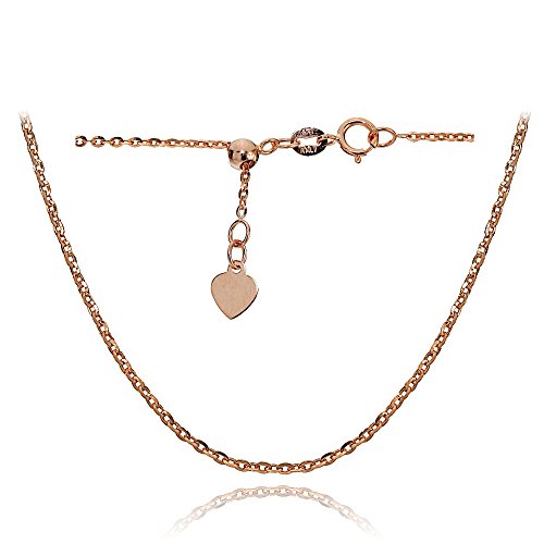This Italian chain anklet features a diamond-cut cable design in 14k rose gold, 1.4mm wide. It showcases an adjustable clasp with dangling hearts. The bracelet extends up to 11-inches.