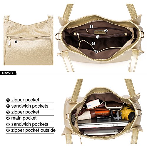 -. Feature : [EXQUISITE MATERIALS] cow leather+Synthetic Leather & Fabric Lining, Hand made by professional artisans.Modern light gold hardware. Metal accessories have been polished, designed to be durable and wear-resistant. / [DIMENSIONS] (L)14.96" x (W)5.12" x (H?10.24" inch / (L)38x (W)14 x (H)26 cm / [INTERNAL STRUCTURE] This leather handbag contains 2 main pocket + 1 zipper sandwich pocket + 2 sandwich pocket + 1 interlayer zipper pocket. Large capacity designed, this bag comfortably holds an iPhone7s Plus, wallet, cosmetic, and other daily things. / [FASHION FOCUS] We have 2 colors, all kind of colors are beautiful and stylish, you can choose any color you like. Hand made by professional artisans. Clear fashion texture, with simple styling, the handbag appearance concise and atmosphere, powerful at the same time. Fully lined interior includes inside pocket, detail stitching matches the bag color. / [ATTENTIONS] NAWO is an US Registered Trademark and our ONLY Authorized dealer is NAWO. Please pay attention to avoid purchasing those COUNTERFEITS from other sellers, 100% genuine guarantee from NAWO. Unauthorized sale without permission,we will investigated for legal responsibility.