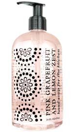 Pink Grapefruit and Lemon Zest Hand Soap, enriched with shea butter, cocoa butter, thyme leaf oil and orange, grapefruit & lemon extracts. 16 ounce bottle.