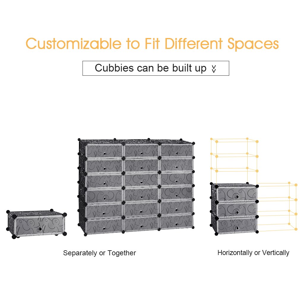 ECO-FRIENDLY MATERIAL: Constructed from ABS connector, PP plastic panel,this Cube Organizer will be eco-friendly and harmless to both you and your pet; Rust-proof iron frame made the panel easy to maintainSTRONG STORAGE ABILITY: 10lbs load-bearing for each cube, this shoe rack can hold shoes from athletic shoes, high heels or work boots to meet your long-term storage needs; dust-proof PP Plastic Doors with metal ring design for easily opening and closing