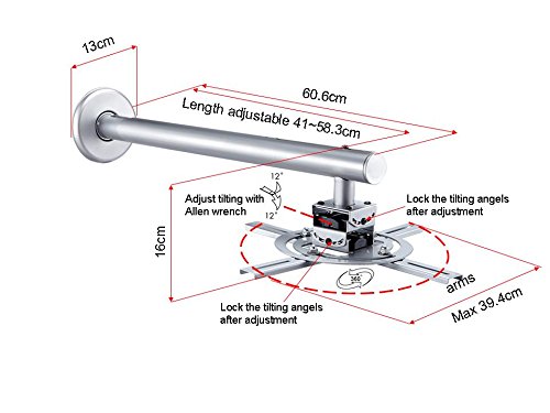 - Feature : Solid metal construction with improved angel lock mechanism. / Projector can be extended from wall from 16" up to 23". The projector can be installed to project forward or backward. / Loading capacity: 25 lb / It can be tilted up and down 12 degree and tightly locked. The projector can be 360 degree swivel / Warranty: One Year from date of purchase.