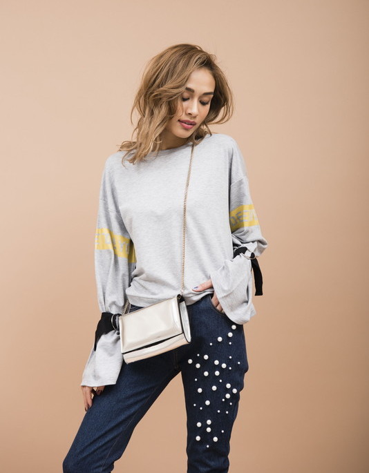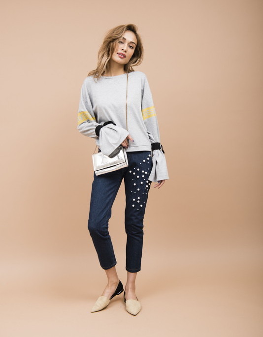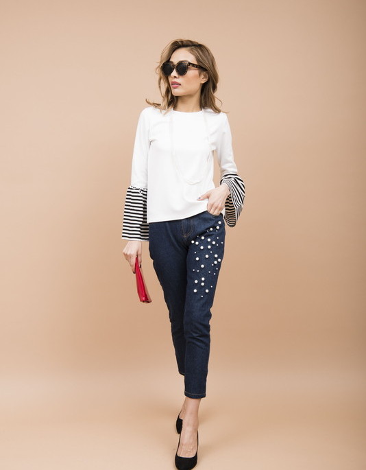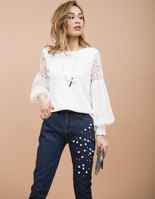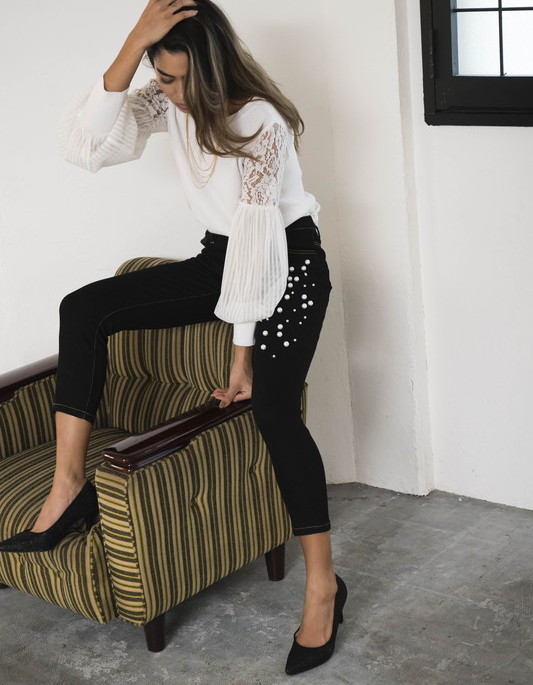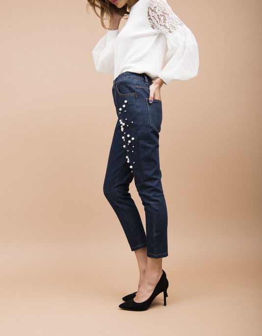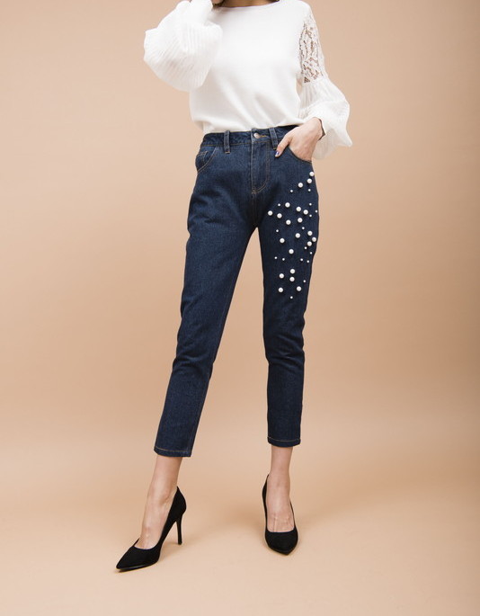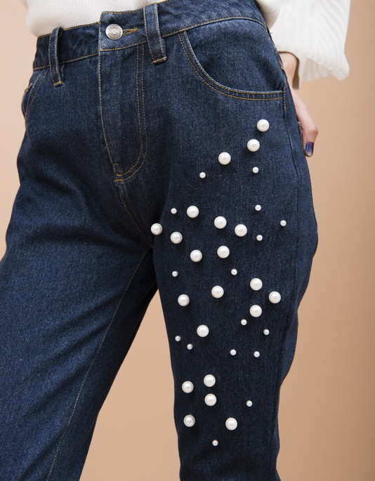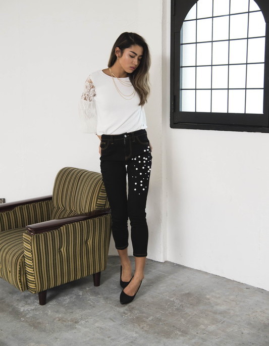 シンプルな細身シルエットにパールスタッズをほどこしたパンツです。程よくストレッチがきいているので動きやすさもあります。