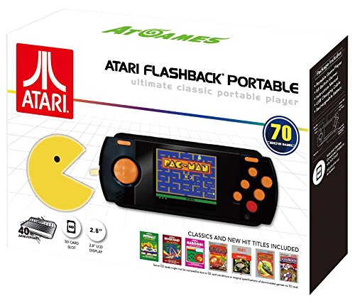 -. Feature : 70 Legendary Atari 2600 hits including: Pac-Man, Dig DugTM, Pitfall!TM, Frogger, and many more / Crisp 2.8 LCD display / Built-in rechargeable battery. Charged by USB cable (USB cable included). Video out port (cable not included) / SD card slot - download more games online (SD card not included) / Contents: - Instruction Manual - Portable Game Player - USB Charging Cable