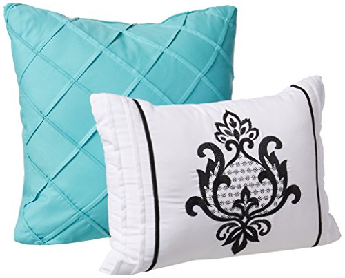 Studio : JLA Home Publisher : JLA Home Binding : Kitchen Product Description For a modern update to your bedroom, the Intelligent Design Leona Comforter Set is perfect for you. A bold black damask pattern is showcased on white ground, creating a stylish and eye-catching contrast. The solid aqua reverse adds a fun and cheerful flair with its bright pop of color to the ensemble. Coordinating sham(s) display the elegant motif of the comforter, while two decorative pillows use embroidered details and fabric manipulation to pull the entire look together. 0