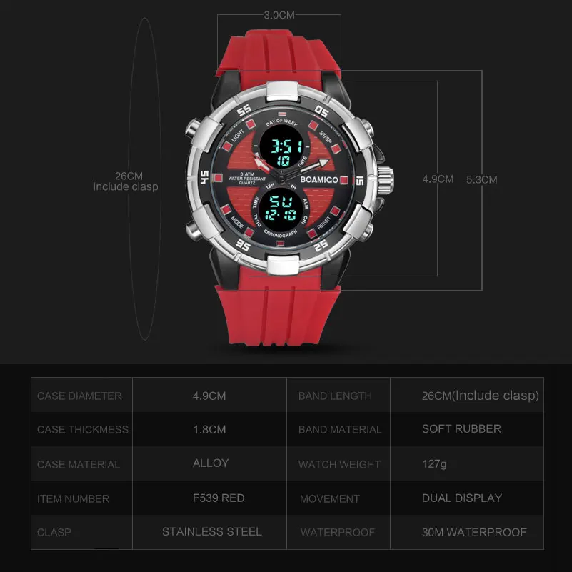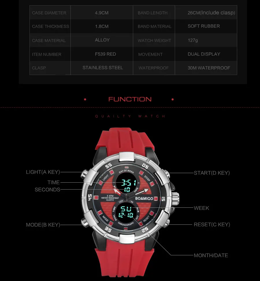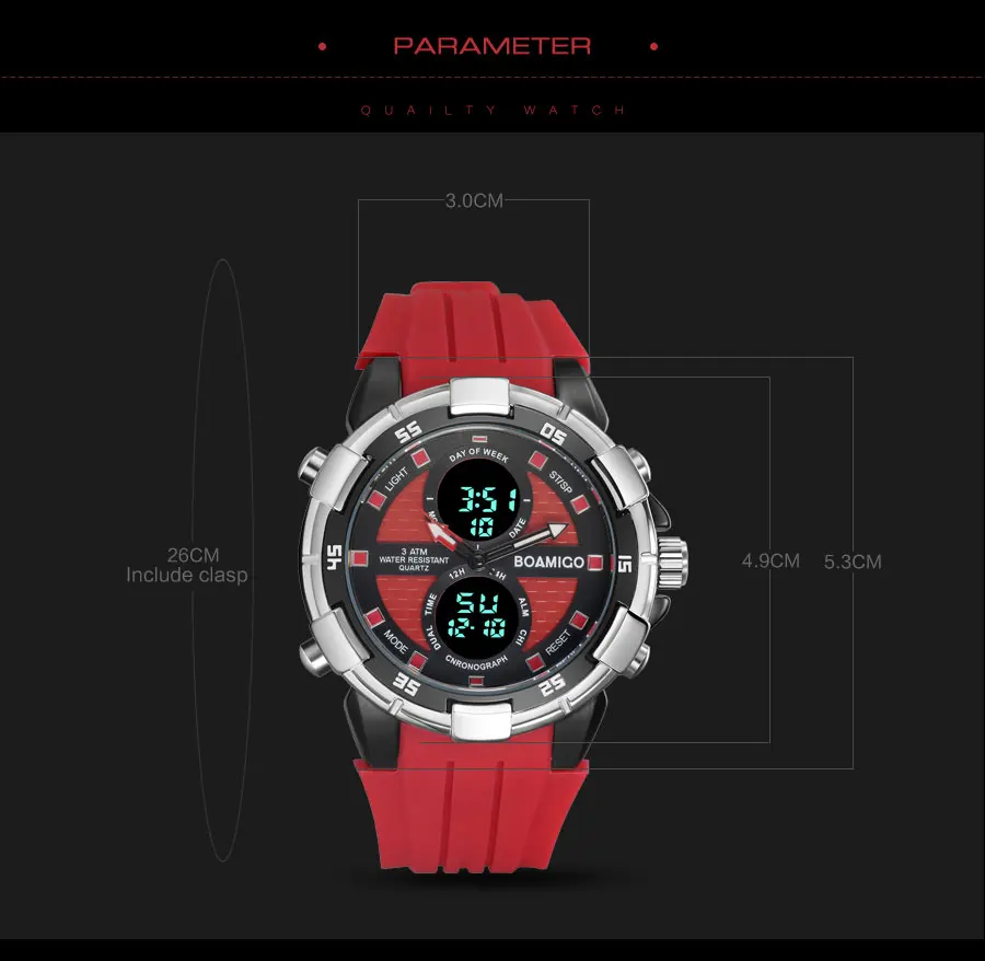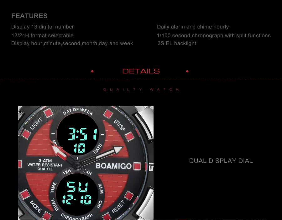 Feature:Water Resistant,LED display,Stop Watch,Complete Calendar,Back Light,Shock Resistant,Chronograph,Perpetual Calendar,Auto Date,Week Display,Alarm,Swim