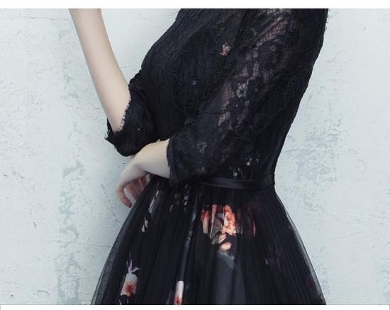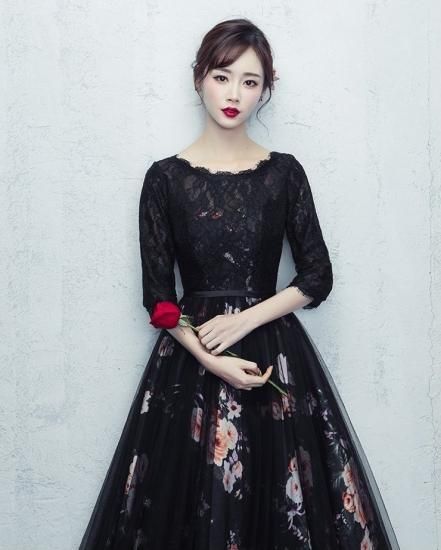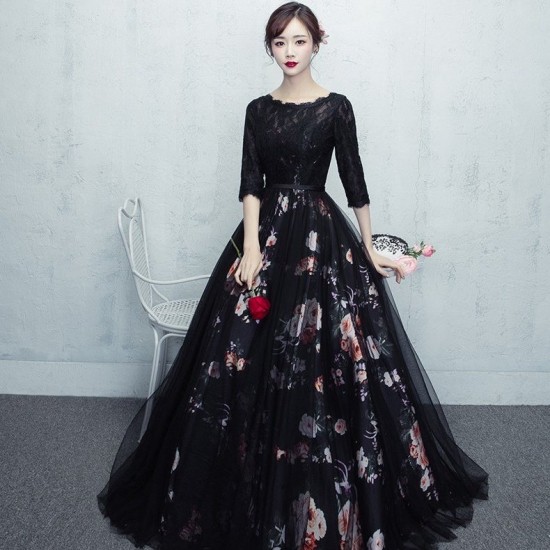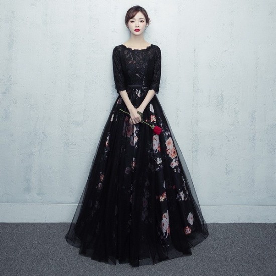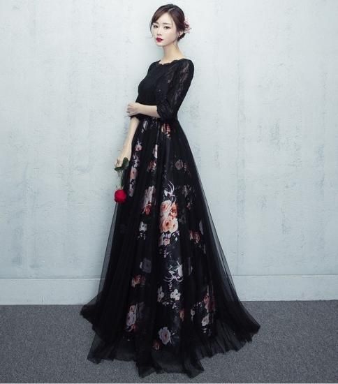 やわらかい雰囲気の七分袖フラワープリントブラックロング丈ドレス。