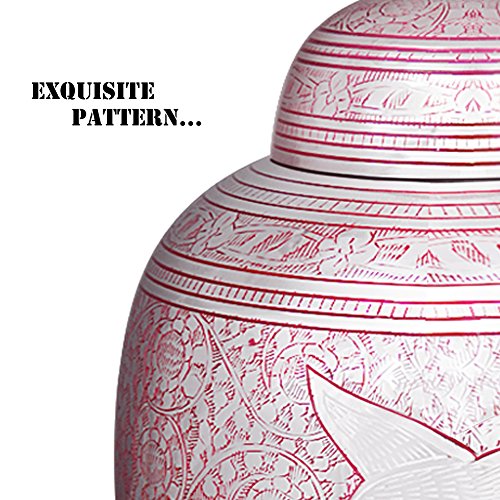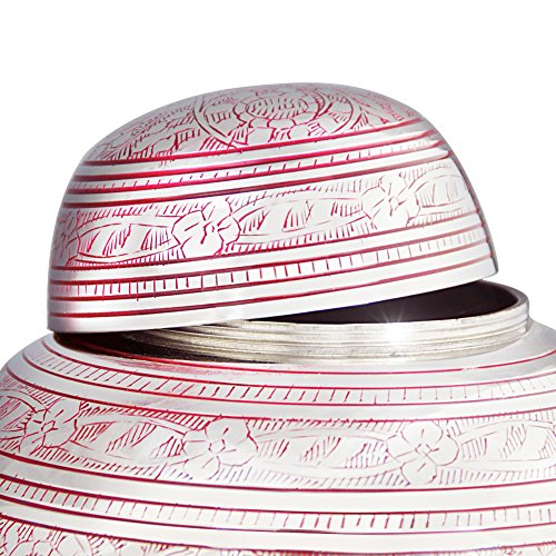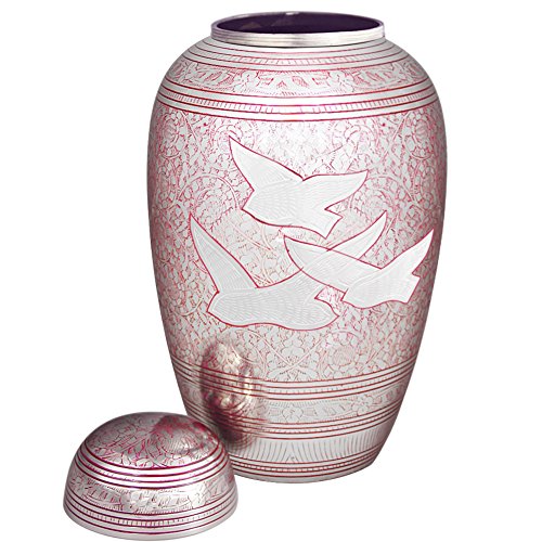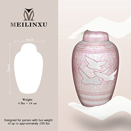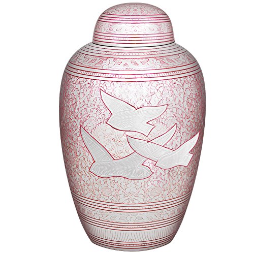 Meilinxu Memorials Brass Cremation Urns Pink Flying Birds Brass Finish * Funeral urn is handcrafted of 100% brass and finished in a Red enamel with bronze etching. * The urn is decorated with a colorful Red enamel and a bird motif etching by experienced artisans in India. * Time-honored design offers an elegant resting place for your loved one. * Pink Flying Birds urn will fit well with any decor, particularly on a mantel over a fireplace or in a library. * Flying Birds Urn evokes the memory of your loved one in a traditional and timeless design. About Meilinxu Memorial Urns * Our urns offer a threaded lid that allows you to safely and securely handle or transport the urn. * Our handcrafting provides each urn with its own uniqueness and variation in color, finish and texture -so no two are exactly alike. Ideal for home, columbarium, scattering, or burial. * Meilinxu urns are maintenance free; simply wipe the hand-made brass urn with a clean dry cloth. * All of our urns are securely packed in a box. * The large/adult urn holds up to 200 cubic inches of cremated remains (one pound weight prior to cremation equals 1 cubic inch), and fit the remains of adults weighing up to 200 lbs. * Package Dimensions: 12.2 inches high x 8.5 inches in Width. 100% Satisfaction Guarantee * We trust that you will be happy with the quality and design of our products * If you are not happy with the design you selected, please return your unused urn to Amazon for a full credit and select another Meilinxu Urn. Click ADD TO CART (above) to order your Memorial Urn today. 0
