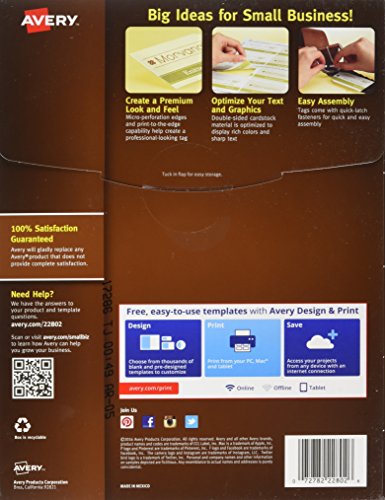 Customize and print double-sided tags for that professional look on your retail items. Tags feature pre-punched holes and fabric string with quick-latch fasteners, ensuring easy, secure attachment to retail goods. Easy to customize: add your company logo as well as branding and product information using free Avery design tools, QR codes and templates. 8 1/2 x 11 sheets for inkjet printers. Size: 2amp;quot; x 3 1/2amp;quot; Colors: White Materials: Paper Fastener: String.Feature