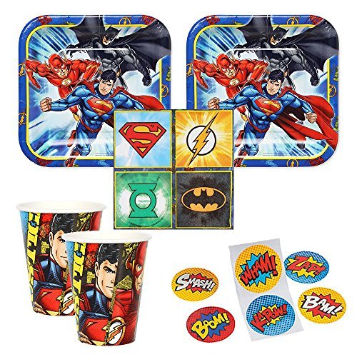 -. Title : DC Comics Justice League party supplies for 16 guests, cake plates, napkins, cups plus bonus stickers