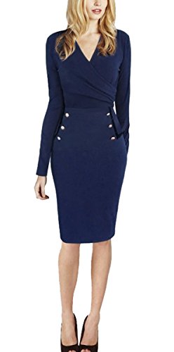 -. Title : LECHEERS Women V-neck Pleated Elegant Bodycon Cocktail Pencil Dress Navy