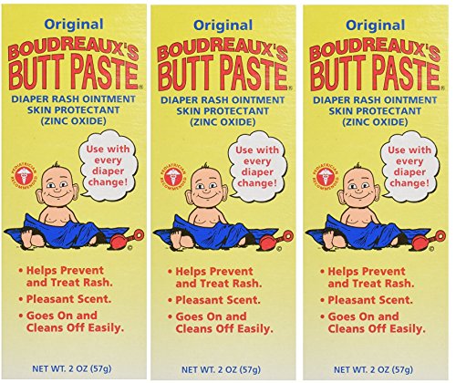 -. Binding : Health and Beauty -. Brand : Boudreauxs -. EAN : 0700064838372 -. Feature : Pack of 3, each 2 oz / Use with every diaper change to reduces diaper rash / Pleasant scent / Goes on and cleans off easily / Pediatrician recommended -. Label : Boudreaux's -. Manufacturer : Boudreaux's -. PackageQuantity : 3 -. ProductGroup : Health and Beauty -. ProductTypeName : HEALTH_PERSONAL_CARE -. Publisher : Boudreaux's -. Size : 2 oz (Pack of 3) -. Studio : Boudreaux's -. Title : Boudreaux's Boudreaux's Butt Paste, Diaper Rash Ointment, Tube 2 oz (Quantity of 3) -. UPC : 700064838372