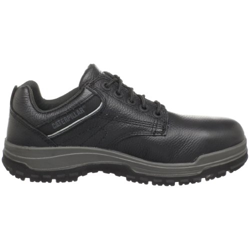 Amazon.com From Caterpillar, this Dimen steel-toed work shoe is ready to work if you are. The full grain leather upper is thicker than other synthetics, while the nylon mesh lining and sock liner as well as the PU molded midsole keeps you comfortable. A steel shank and toe add protection, and the outsole is slip-resistant for stability. 0