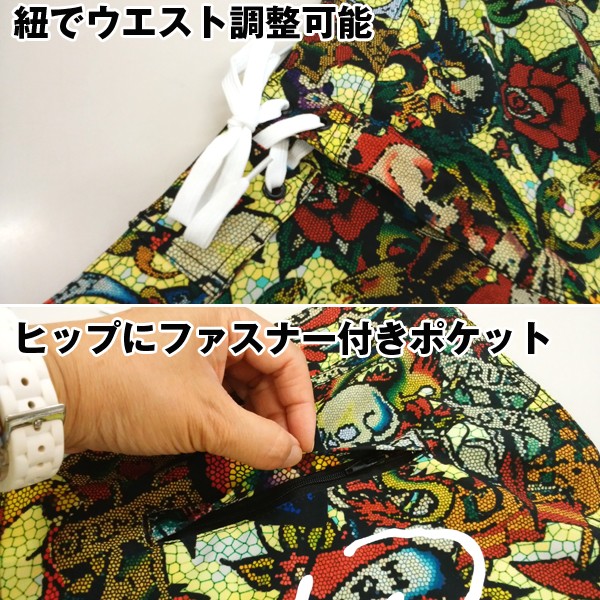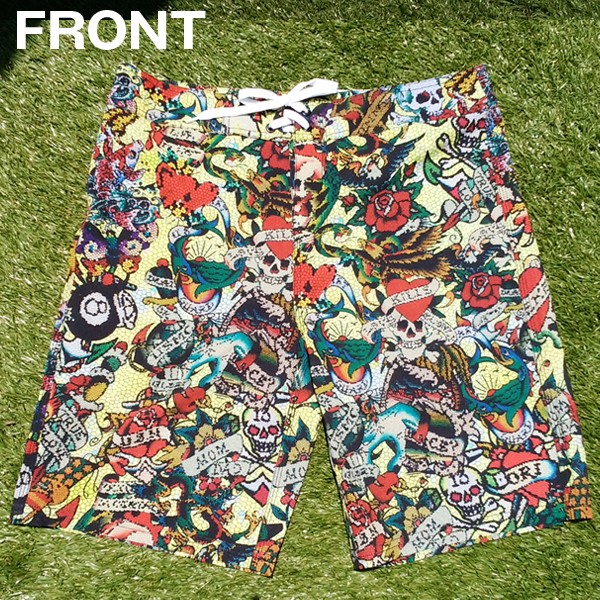 エドハーディの夏が来た!!真夏の太陽の下、ド派手プリントが輝くメンズスイムパンツ2016新作お披露目!! 通常価格4,212 の処、特別価格4,050 円にて限定販売! 毎年、この時を待ち望むファンも多い、エドの海パン!! ロックとタトゥーの融合。デザインの質の高さ、絶妙なカラーリングはさすがのエドハーディー!今年もやってくれました!! 人気の高い、ボートショーツ。 今年は2柄。 イエローグリーンをベースにエドハーディー独特のスカルやハートをエキゾチックに大胆プリントした「イエロー」。 ホワイトをベースに、朝顔のような色とりどりの美しい花の大輪を描いた「花柄」。さりげなく、スカルがところどころに配置されかわいらしさもプラス。 どちらもヒップには、「ED HARDY」ロゴがプリント。 右ヒップにはファスナー付きポケット(深さ約15cm)が装備。 紐でウエスト調整可能です。 ※サイドポケットはございません。 さあ!ビーチで他の人とは一味違った水着でかっこよくキメましょう♪■素材:ポリエステル100%
