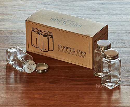 CLASSIC DESIGN - This premium set of 10 Spice Jars comes in a french square design. The square shape allows the jars to be stored side by side more compactly than round shaped jars. The four flat sides make labeling easy. Each clear glass jar holds 6 ounces.