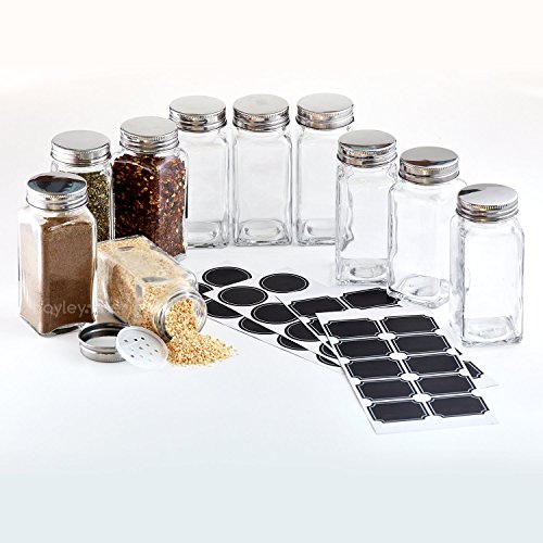 Hayley Cherie - 6 Oz Large Square Glass Spice Jars (Set of 10) - Chalkboard Labels, Stainless Steel Lids and Shaker Inserts