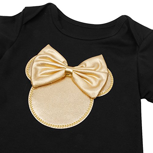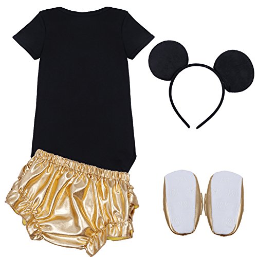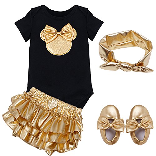 -. Feature : Infant baby girls' adorable Minnie outfits with headband/ hair hoop / Short sleeves, unique collar, front with shinny applique of Minnie / Snap closures at bottom for easy diaper changing, bubble bot design with tiered ruffle trimmings on the bum / Soft crib shoes with stitched bowknot and removable pads / Suitable for birthday party, photography, holiday or daily wear